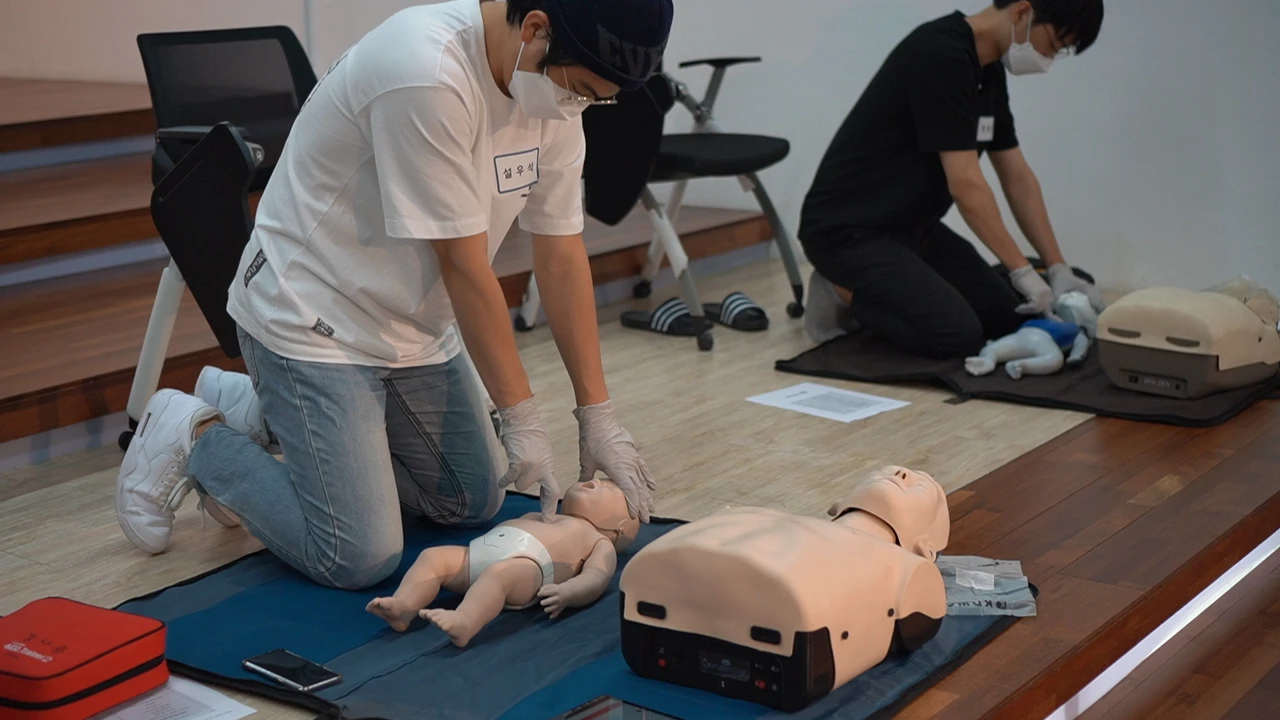 심폐소생술 이론교육, 응급상황을 고려한 일반인과 유아 심폐소생술 시뮬레이션을 진행했습니다.